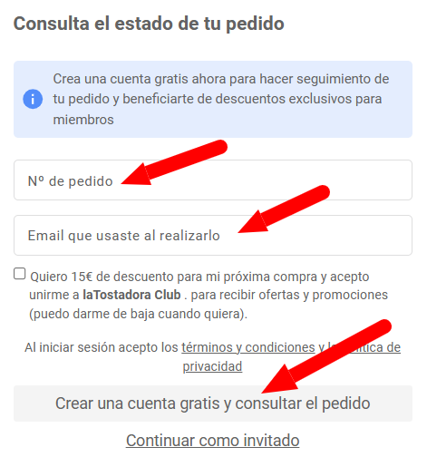 1. Accede "Consulta el estado de tu pedido" y indica el número de pedido y el email con el que has realizado la compra.